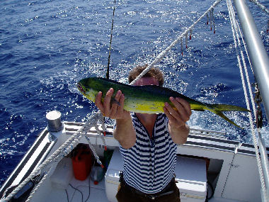 Mens vi sejlede havde vi fiskestænger i vandet, og der var ofte bid. Vi fangede en del guldmakreller og skipjack tunas. På et tidspunkt så vi 4 marlins helt oppe i havoverflladen – men de bed desværre ikke på vores fiskekroge. Dette syn var helt utroligt og selv vores skipper var begejstret, skønt han ellers har oplevet en del på havet.