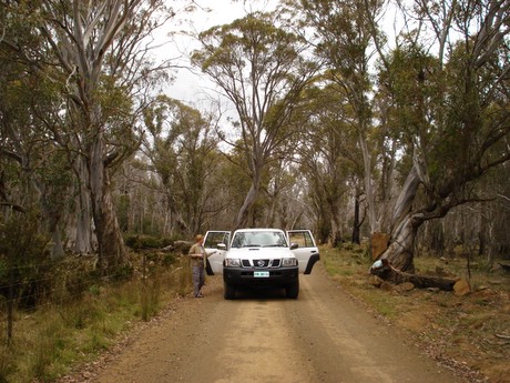 Tidlig fredag morgen er vi endelig klar til at starte vores feltundersøgelser. Vi forlader Hobart med bilerne fulde af udstyr og tager nordpå mod søerne i det Centrale Plateau. Før vi tog herned bestilte vi to store firehjulstrækkere i Hobart, så nu er vi godt kørende i to Nissan Patrol’s. Da vi forlader asfalteret alfarvej kommer vi ind i et flot naturområde, hvor grusvejen snor sig gennem en åben skov af Eucalyptustræer.
